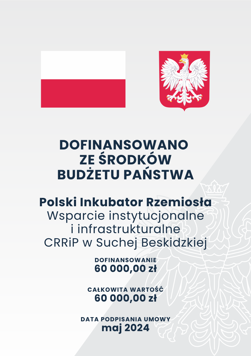 W dniu 2024-05-14 Cech Rzemiosł Różnych i Przedsiębiorczości w Suchej Beskidzkiej podpisał z Narodowym Instytutem Wolności – Centrum Rozwoju Społeczeństwa Obywatelskiego umowę o dofinansowanie zadania pt. „Wsparcie instytucjonalne i infrastrukturalne CRRiP w Suchej Beskidzkiej” realizowanego w ramach Rządowego Programu Polski Inkubator Rzemiosła na lata 2021-2030 r.